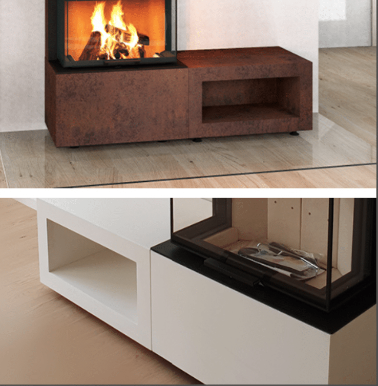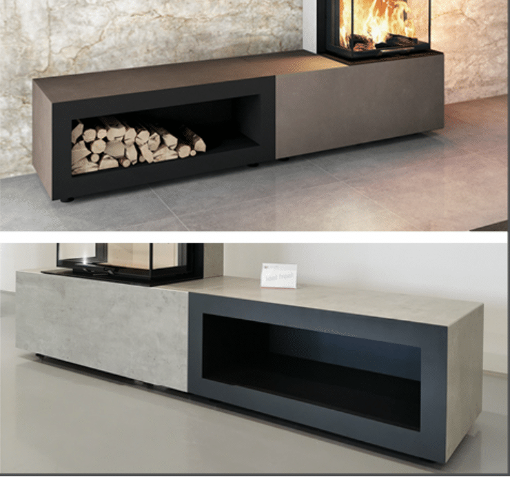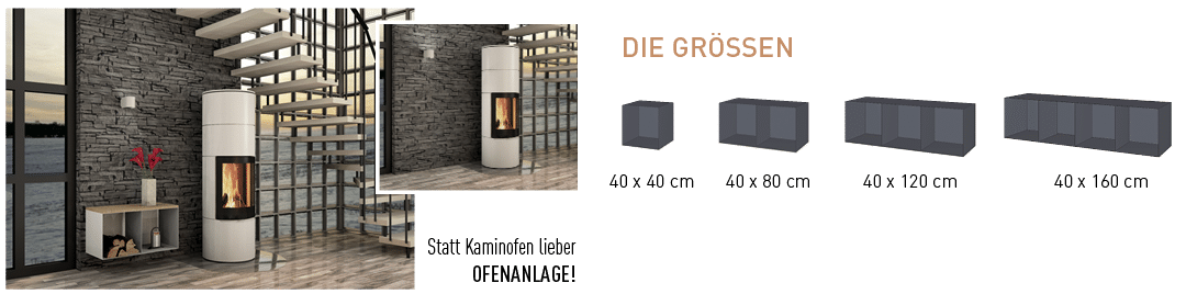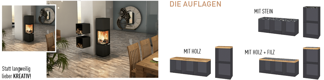 Wählen Sie zunächst Ihre ideale Größe und Farbe und anschließend eine Auflage, wahlweise aus Holz oder Naturstein. Für die neocube Kaminanlagen haben wir dreiseitig, mit wählbarer Keramik, verkleidete Regale. Wenn Sie wünschen, auch auf den Millimeter genau gefertigt.